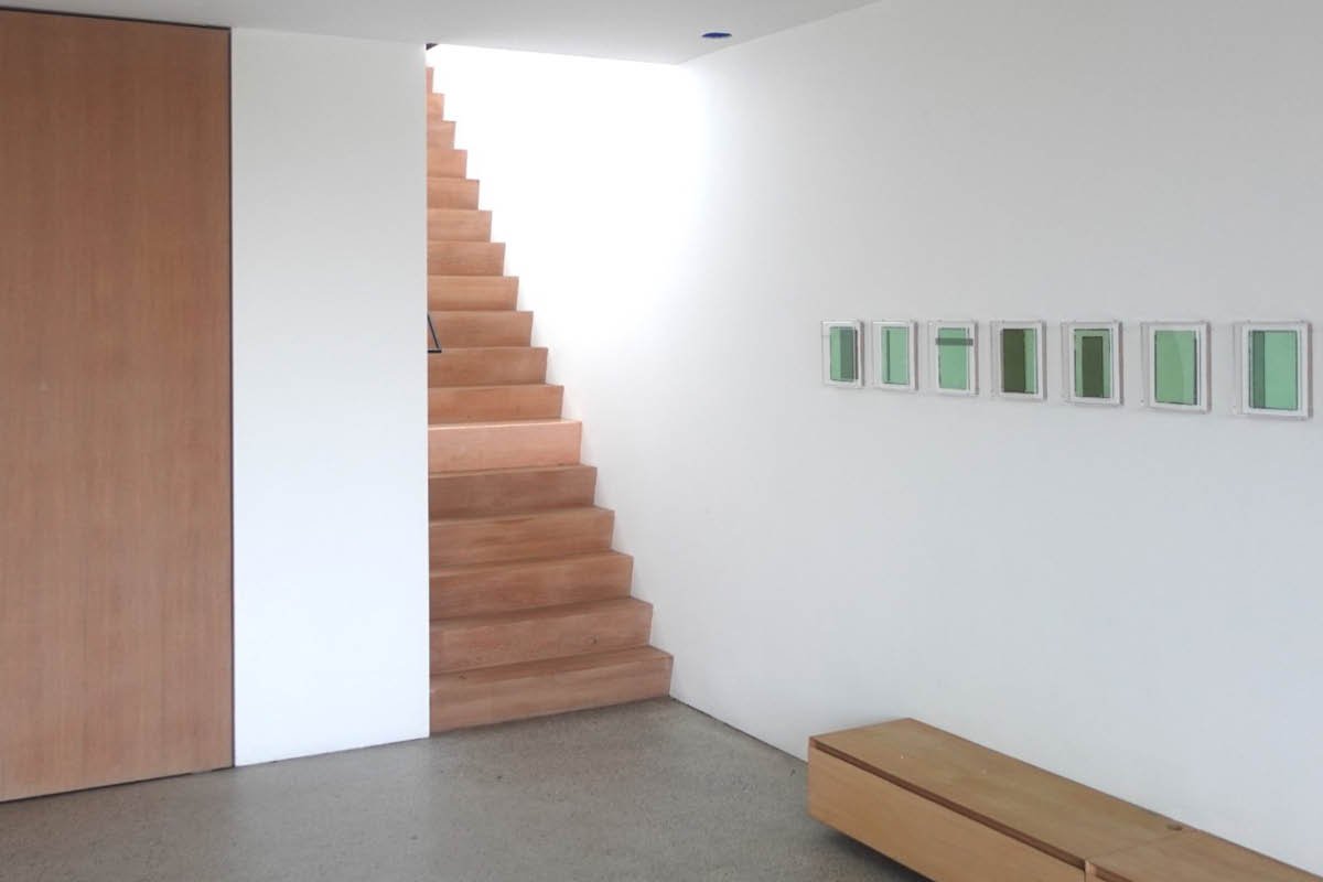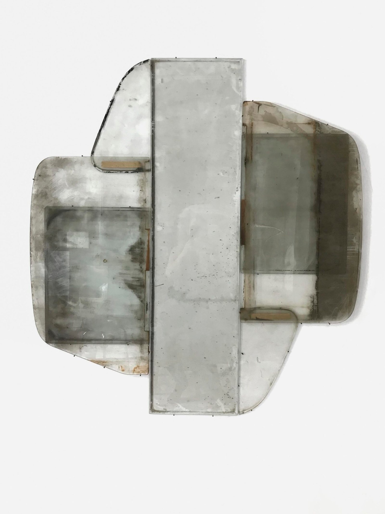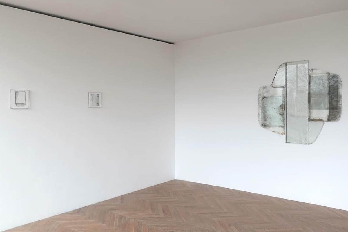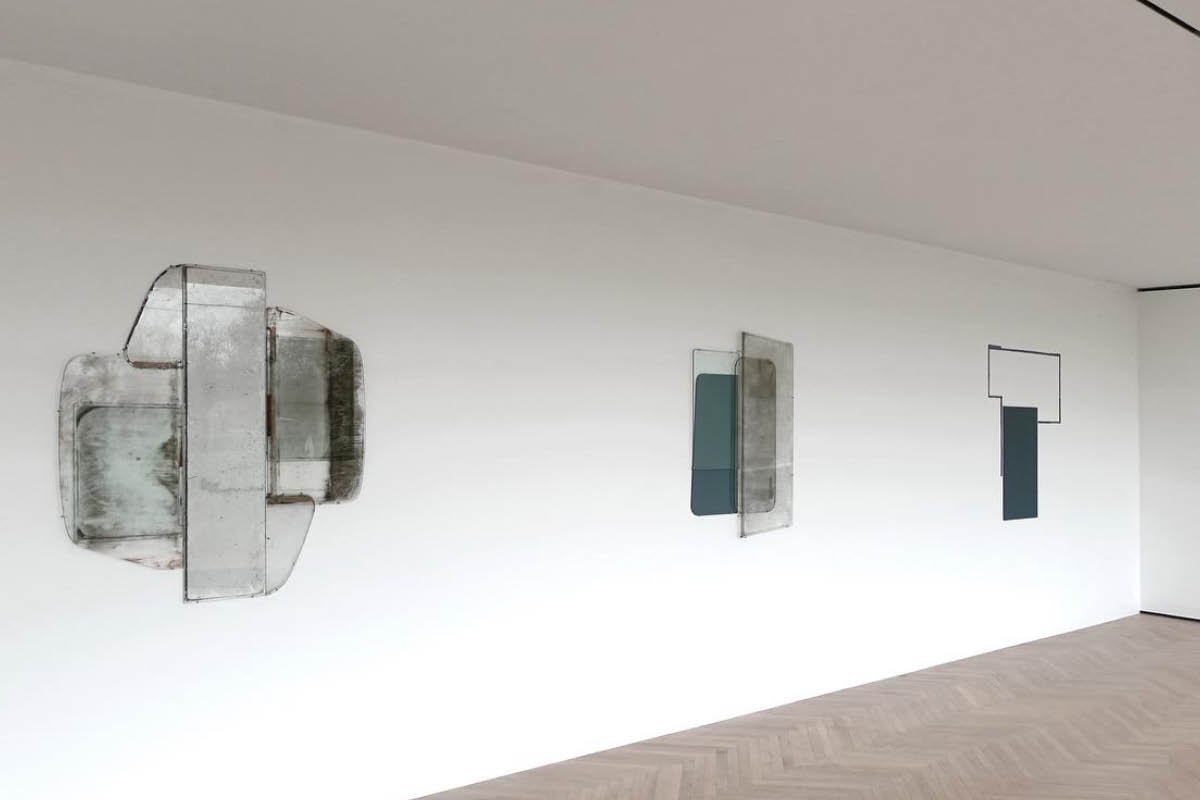 Most of the dusty glass panes were found in an abandoned factory, lending the strictly phenomenological character of the works a narrative quality that infuses the experience of ‘here and now’ with aspects of ‘there and then.’ Eussen’s glass constructions not only deconstruct conventional modes of display, they also summon the imprints of the sights that were seen through the windowpanes they recycle and the lives of those who saw them. In this sense the recycled glass panes are like relics—traces of what has been long gone—or rather, flat crystal balls evoking past time chronologies.