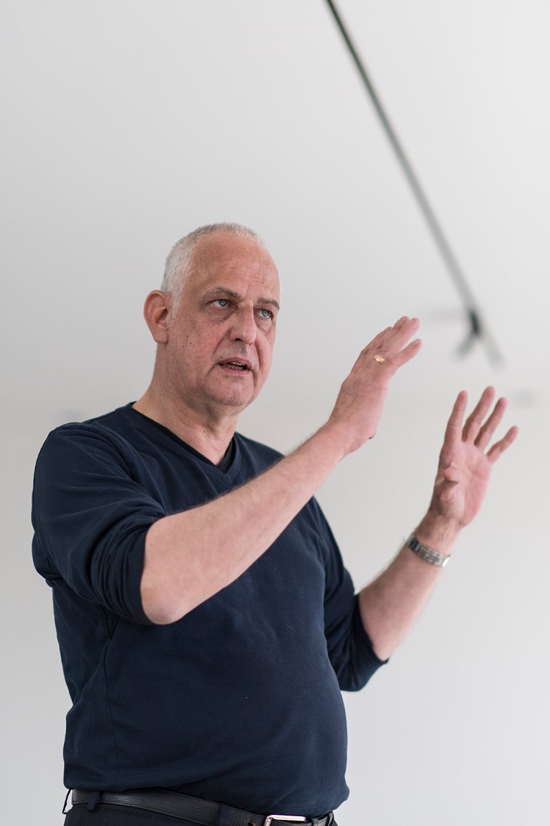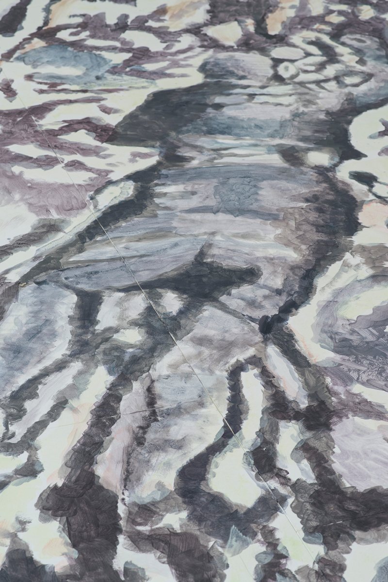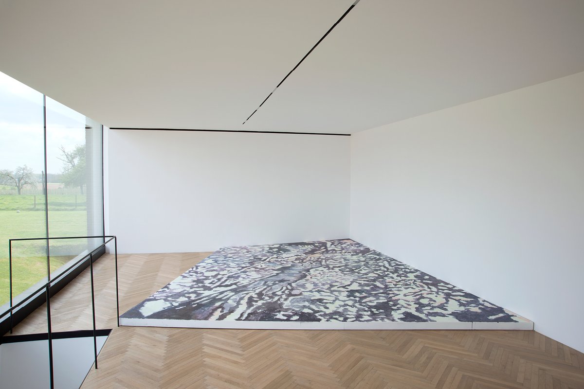 Luc Tuymans was the first artist to realize a work at Re:set Home in 2017. On the upper floor, overlooking the Haspengouw landscape, he created the floor painting De Swamp. The work is a translation of a painting on canvas into a monumental, spatial scale. The image unfolds as a marsh in which a figure appears to be trapped, oscillating between presence and disappearance.
